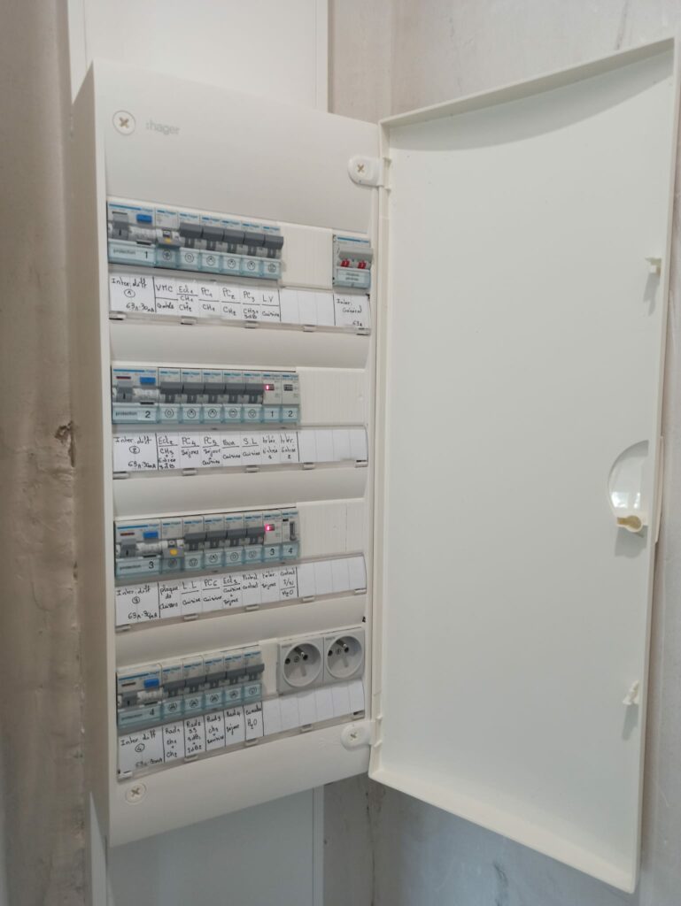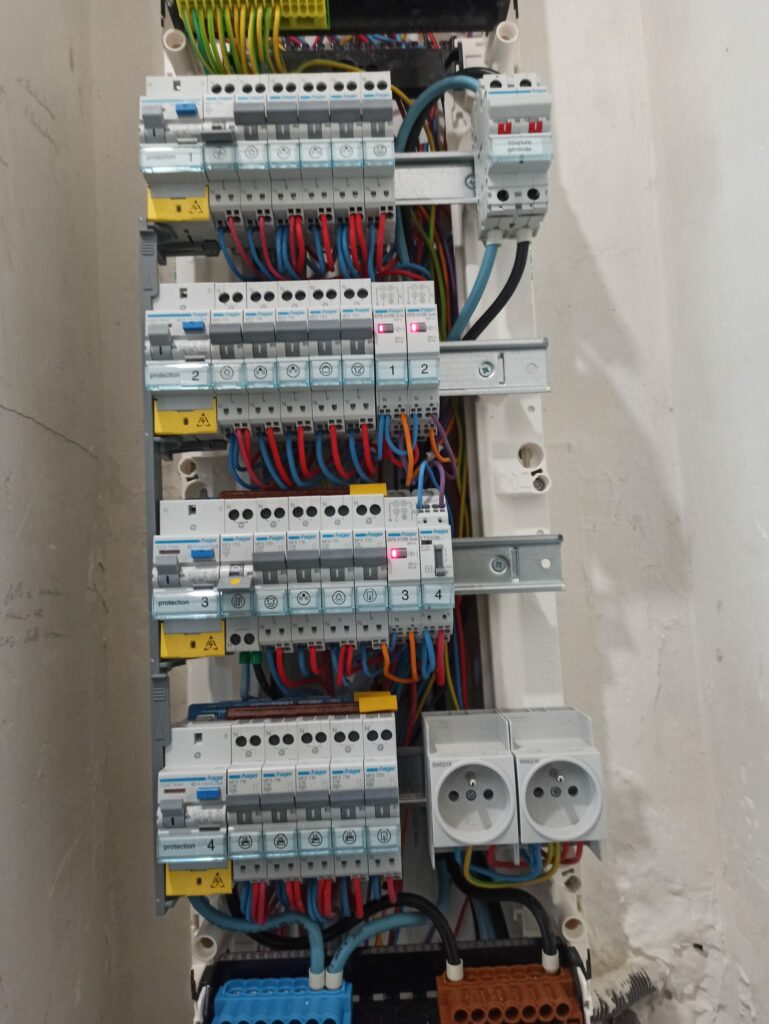 Chantier situé à Cantepau, rue Général Desaix à Albi. Rénovation et mise en conformité d’un tableau électrique et d’une installation électrique monophasée. Cuisine, séjour, garage, avec réalisations de saignées, rebouchées au plâtre et enduits.