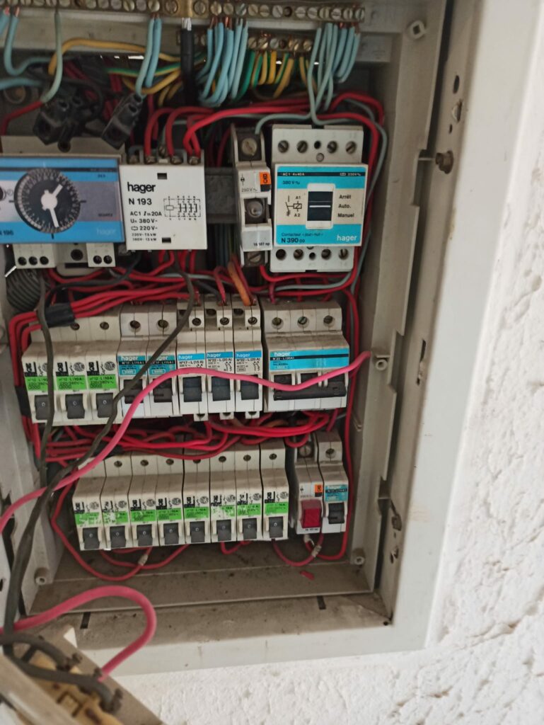 Chantier à Pampelonne a proximité du barrage de Thuriès. Mise en sécurité d’une installation électrique monophasée avec installation d’un interrupteur différentiel 30 mA et de disjoncteurs de différents calibres.