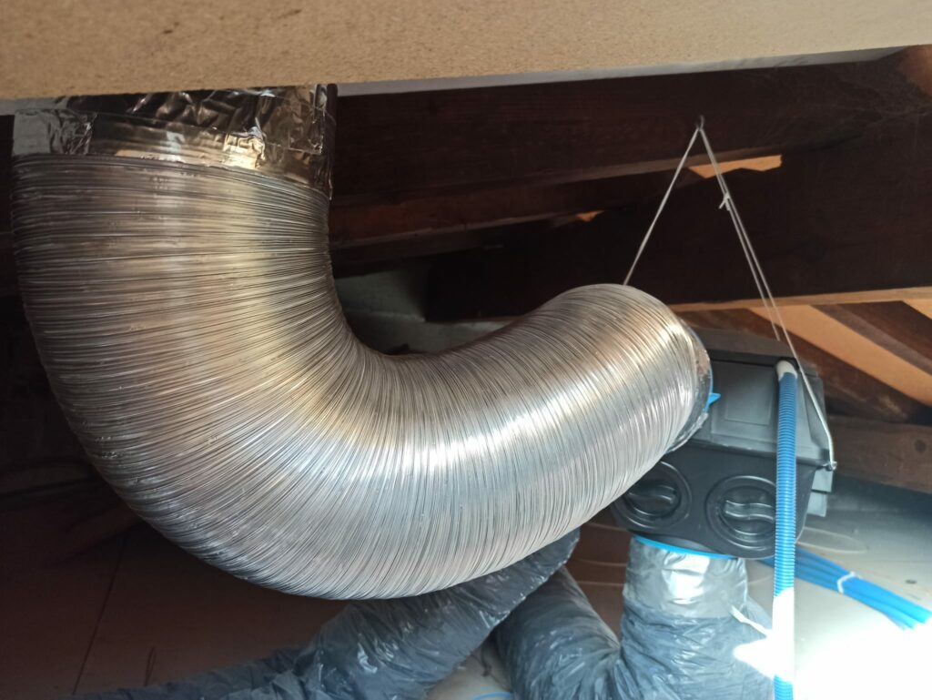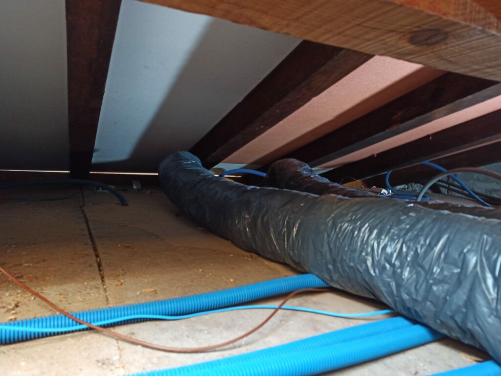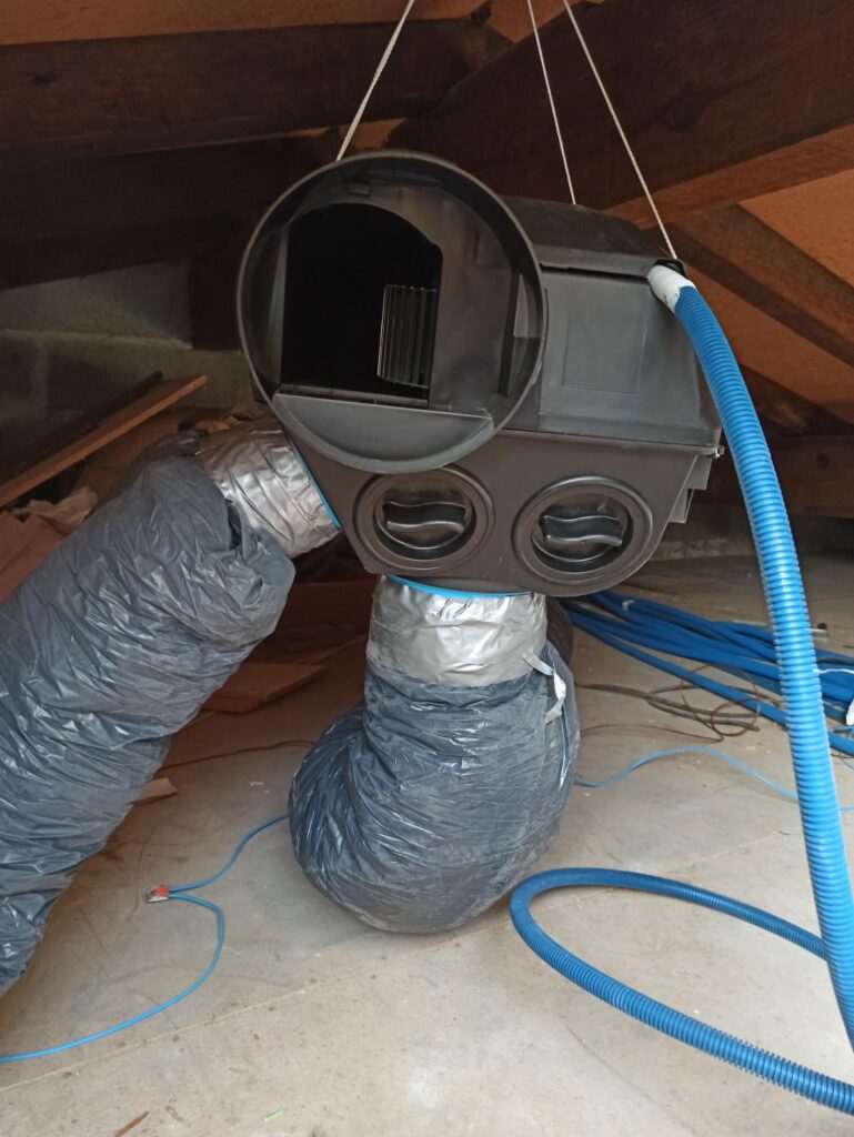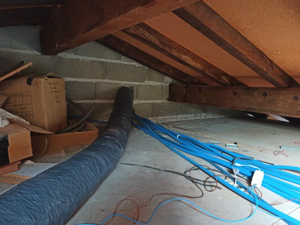 Rénovation électrique sur Albi à la Renaudié. Rénovation électrique totale en encastré et en goulotte PVC Legrand. Installation VMC simple flux hydro-réglable incluant les gaines isolées dans les combles en utilisant l’ancien conduit de cheminée condamnée.
