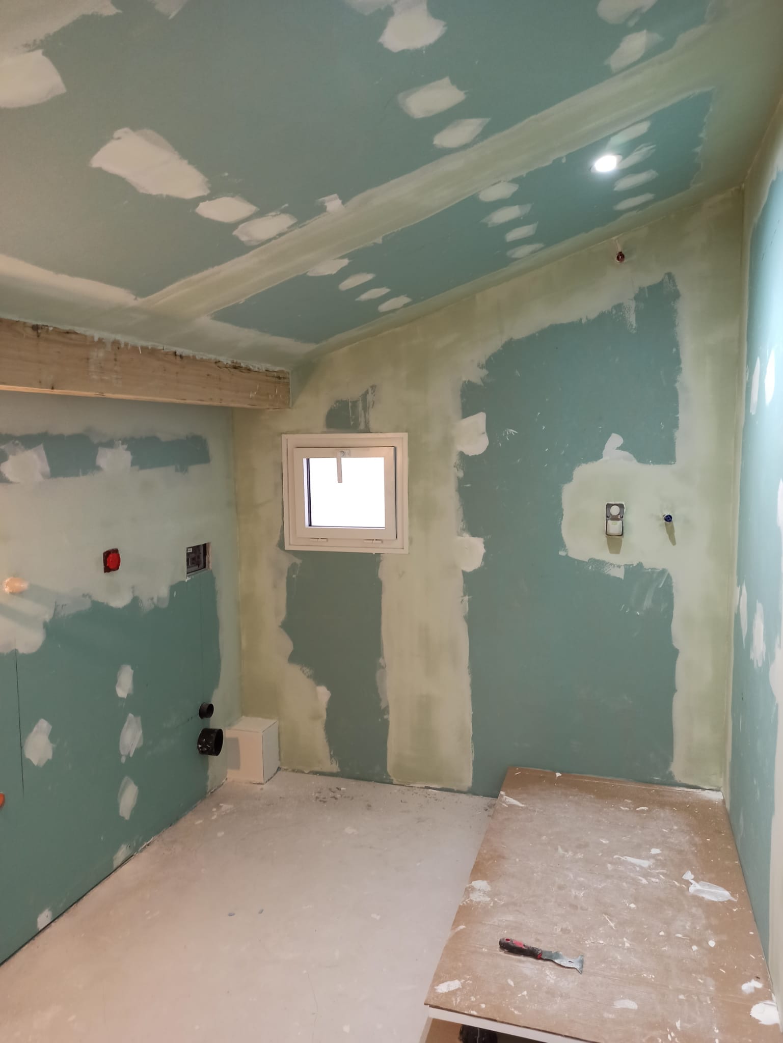 Chantier situé à Albi à Côté de l’hôtel Mercure boulevard de Strasbourg. Installation d’un interrupteur différentiel 30 mA triphasé et de deux disjoncteurs triphasé. Restauration complète d’un plafond impacté par un dégât des eaux. plâtre, enduit, sous-couche glycéro, peinture acrylique double couches.