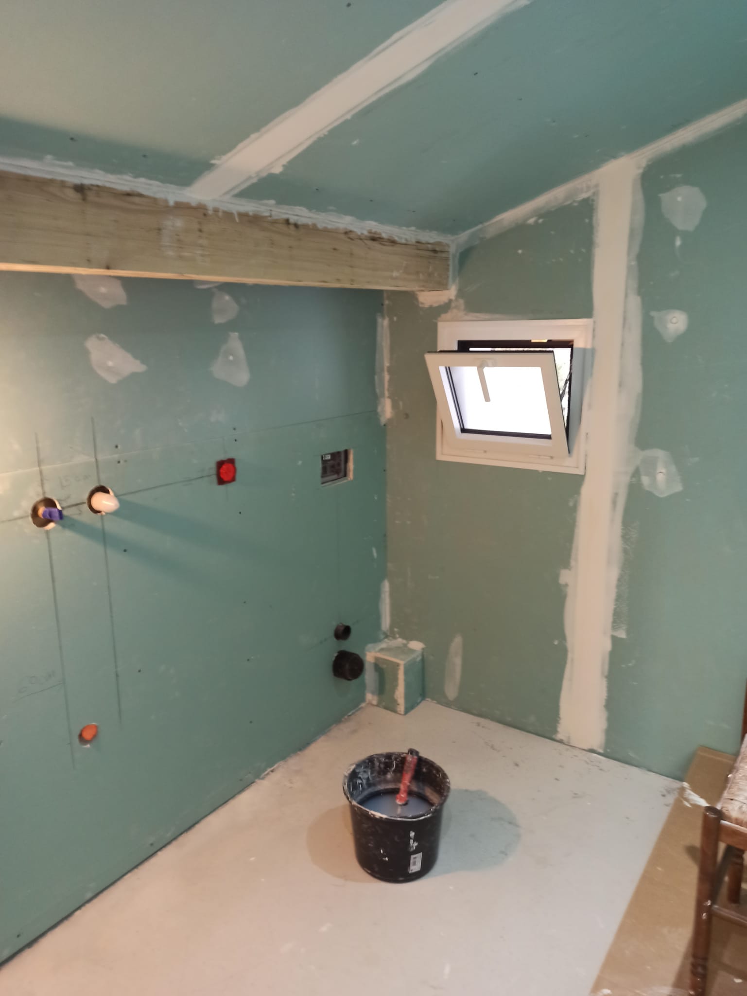 rénovation second œuvre avec pose de parquet, placo, électricité, habillage velux, faïence. Suite à un dégât des eaux de la salle de bain et à l’aménagement des combles. Pose d’OSB dans les toilettes avant pose du parquet.
