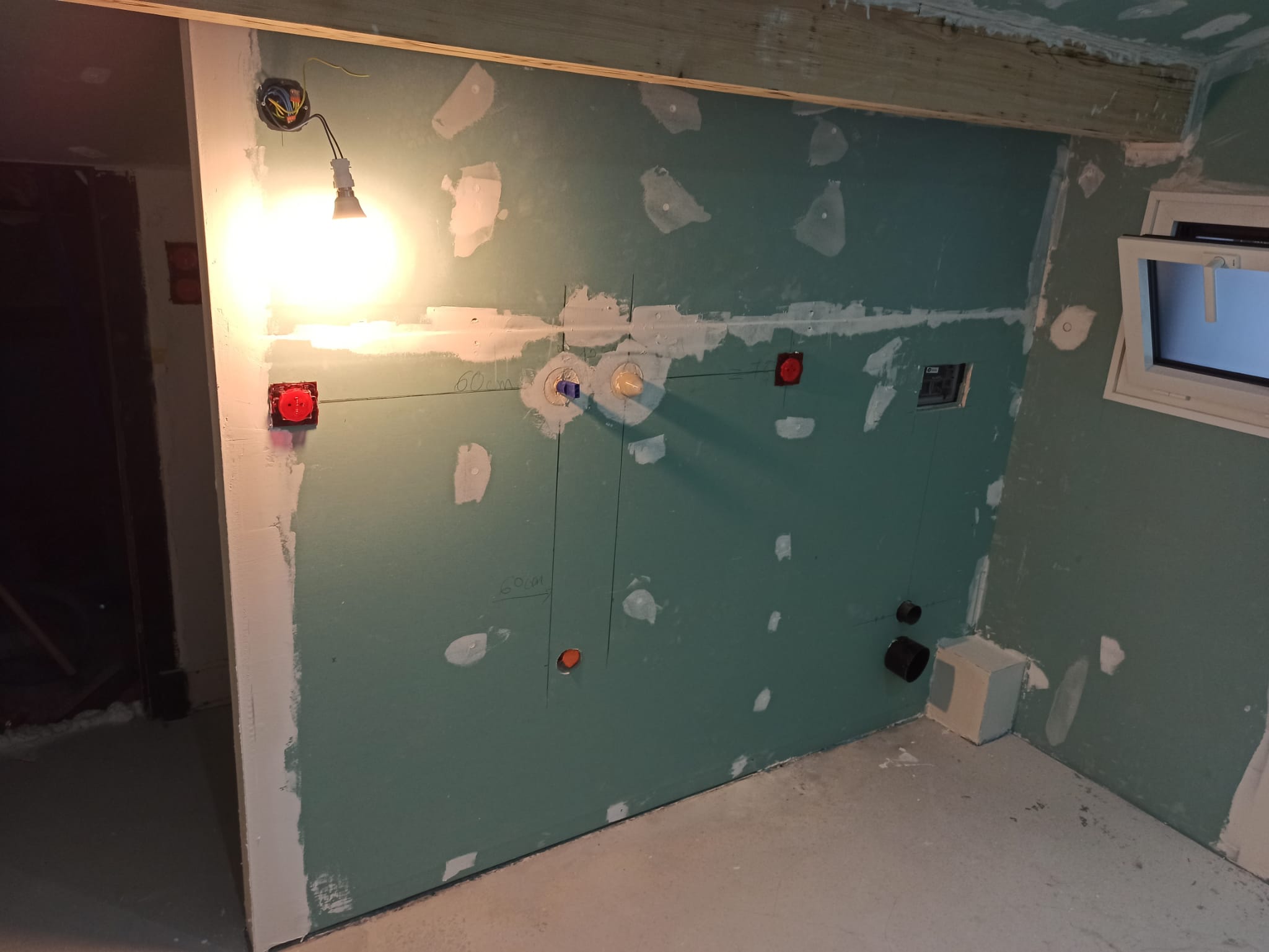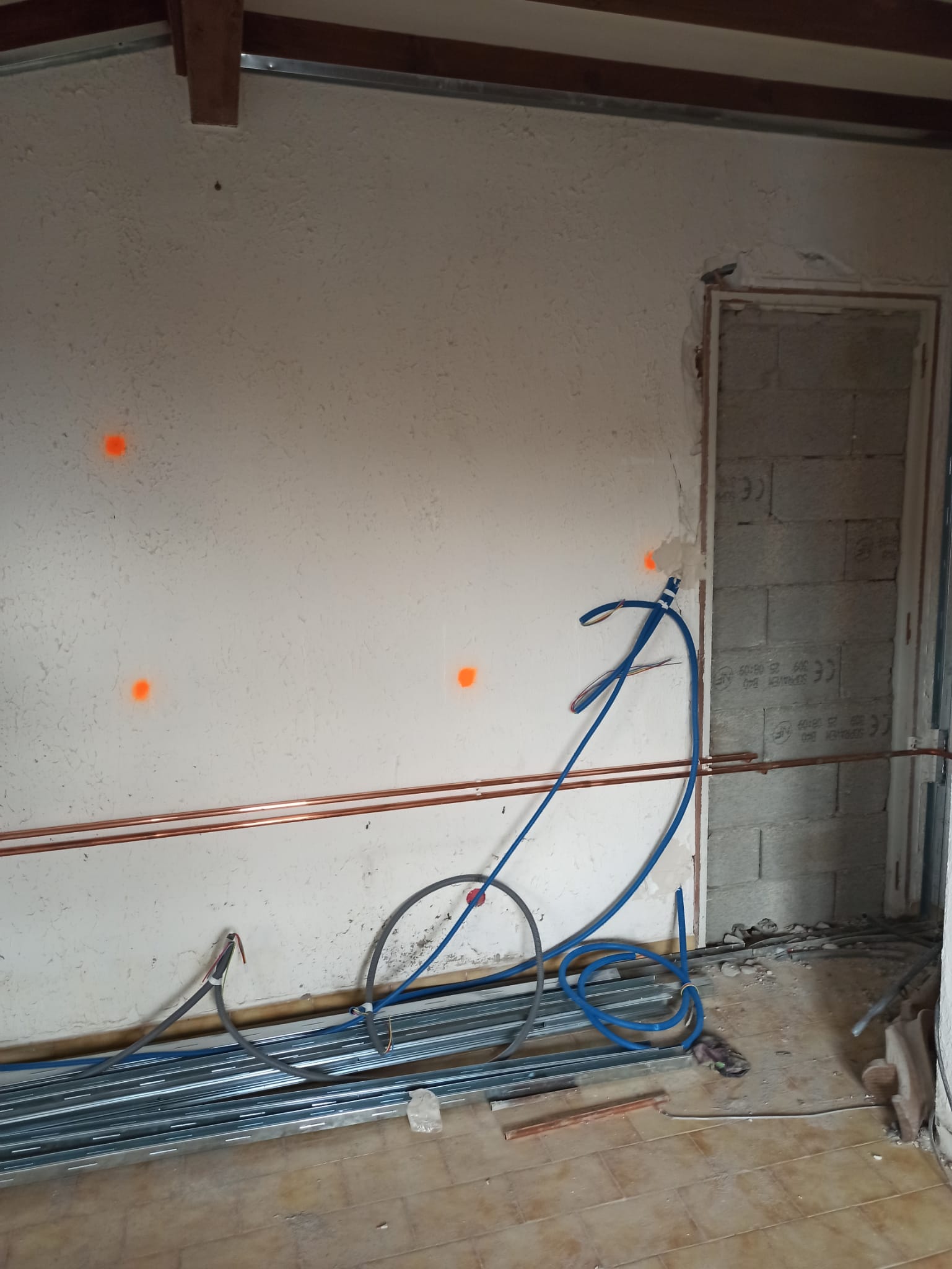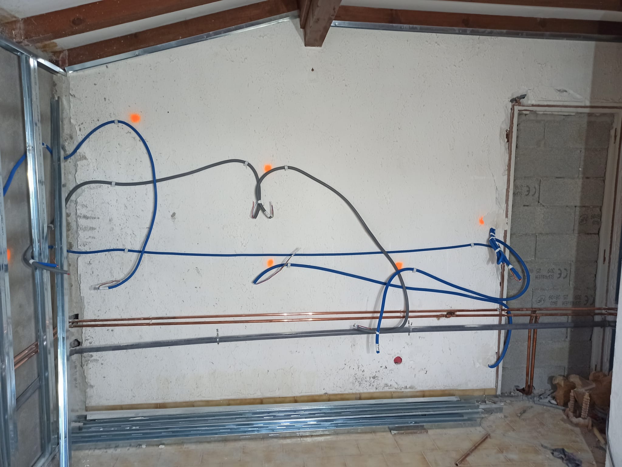 Chantier situé à Albi chemin de lavazière, extension d’un éclairage intérieur LED avec réglage de la température lumière, de sous-sol avec prise RJ45 + prise monophasée murale raccordée au réseau. Installation apparente avec des tubes IRL fixé au plafond.